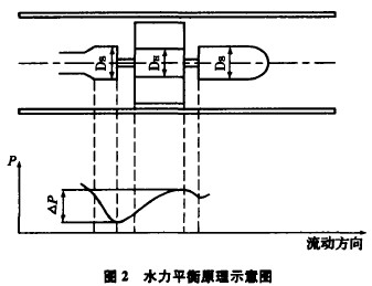 由于流體通過渦輪時(shí)會對渦輪產(chǎn)生一個(gè)軸向推力,使軸承的摩擦轉(zhuǎn)矩增大,加速軸承磨損,為了消除軸向力,需在結(jié)構(gòu)上采取水力平衡措施,這方法的原理見圖2所示。由于渦輪處直徑DH略小于前后支架處直徑Ds,所以,在渦輪段流通截面擴(kuò)大,流速降低,使流體靜壓上升△P,這個(gè)△P的靜壓將起到抵消部分軸向推力的作用。