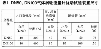 在大氣壓力條件下,借助于標準表法氣體流量標準裝置(以下簡稱標準裝置),對于丹東東發(fā)集團有限公司生產(chǎn)的系列小口徑氣體渦輪流量計,選擇DN50、DN100兩種口徑的流量計做擾動試驗,即分別測試流量計低、高水平的無擾動與擾動條件下的指示誤差,并進行比對、分析。