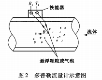 多普勒法是利用聲學(xué)多普勒原理確定流體速度。多普勒原理是若聲源和目標(biāo)之間有相對運動,會引起聲波在頻率上的變化,頻率變化正比于運動的目標(biāo)和靜止的換能器之間的相對速度。圖2是超聲多普勒流量計示意圖。發(fā)射晶體T1發(fā)射的超聲波遇到流體中運動的顆?;驓馀莘瓷浠貋碛山邮站wR1接收,發(fā)射信號與接收信號的多普勒頻率偏移與流體速度成正比。忽略管壁影響,假設(shè)流體沒有速度梯度且粒子是均勻分布的,可得: