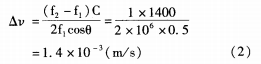 假設(shè)發(fā)射晶體T1的發(fā)射頻率f1為1MHz,θ角為6O°,頻率差f1一f2的測量精度為1Hz,聲波在水中的傳播速度為1400m/s,則多普勒法在水中的速度測量精度為: