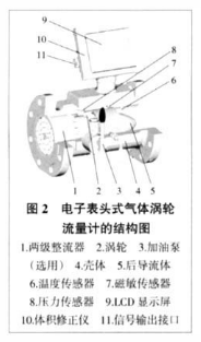 如圖2,電子表頭式的氣體渦輪流量計(jì)主要山殼體、整流器、渦輪、信號(hào)檢測(cè)器、溫度傳感器、壓力傳感器,LCD顯示屏體積修止(X)、潤(rùn)滑油泵幾部分組成。