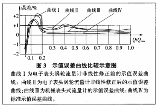 從專業(yè)技術(shù)角度來(lái)說(shuō),電子表頭式渦輪流量計(jì)一般由于無(wú)法有效降低儀表內(nèi)部阻力,不經(jīng)修正的示值誤差曲線多處(多段)超差,只有通過(guò)將儀表流量分為幾段采用不同的儀表系數(shù)進(jìn)行非線性修正,才能使它達(dá)到合格示值誤差曲線的要求。機(jī)械表頭式渦輪流量計(jì)的示值誤差曲線完全由儀表的結(jié)構(gòu)設(shè)計(jì)技術(shù)水平、零部件制造水平、裝配工藝水平、整機(jī)測(cè)試水平來(lái)決定,不存在非線性修正的問(wèn)題。示值誤差曲線比較如圖3所示。