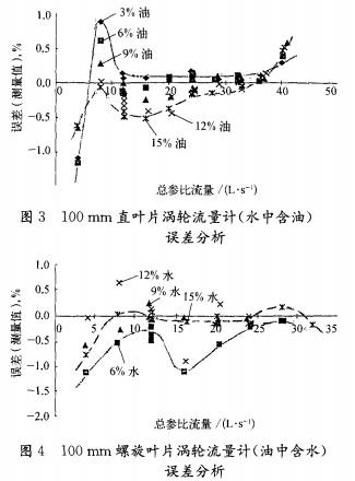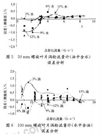 3)油中含水與水中含油兩者誤差變化的差異。渦輪流量計(jì)測(cè)量水中含油*二組分體積分?jǐn)?shù)變化引起測(cè)量誤差變化比油中含水大。