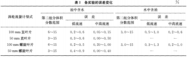 油水混合液在水平管道內(nèi)靜止時(shí)油和水是分層的;在開始流動(dòng)或很低流速時(shí)處于油水兩層的分層流;隨著流速增加油水逐漸混合,流速愈大兩相混合愈均勻;當(dāng)進(jìn)入渦輪葉片轉(zhuǎn)動(dòng)時(shí)兩相混合將更為均勻。因此,混合液兩相均勻程度是影響測(cè)量誤差的因素之一。