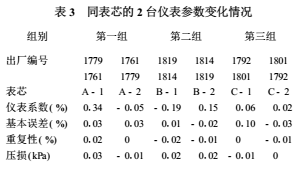 將每組儀表的2臺(tái)表芯對(duì)換,重新進(jìn)行檢定,獲取檢定數(shù)據(jù),列于表2。將同表芯的2臺(tái)儀表參數(shù)進(jìn)行比較,獲得比對(duì)結(jié)果,列于表3。其中儀表系數(shù)以相對(duì)(百分?jǐn)?shù))表示。