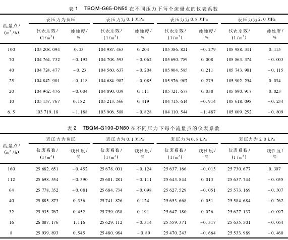 不同壓力下每個流量計(jì)的儀表系數(shù)如表1和表2所示。