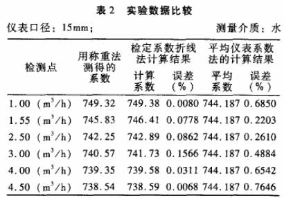 被檢儀表:公稱通徑分別為10mm和15mm的渦輪流量傳感器各一臺;檢定裝置:靜態(tài)稱重法標準水流量檢定裝置,系統(tǒng)精度+0.2%。分別采用常規(guī)的平均儀表系數(shù)法和檢定系數(shù)折線法進行標.定,并與作為標準的靜態(tài)稱重法的檢定結果進行比對,結果見表1.表2。