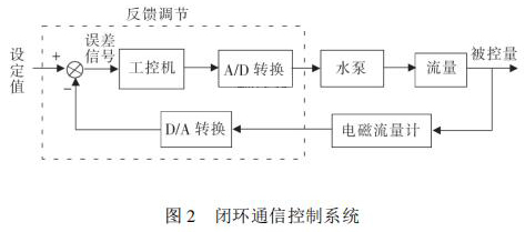 通信控制系統(tǒng)由工控機、變頻器、水泵、數(shù)據(jù)采集卡、消防水流量計等組成。在整個熱量表耐久性試驗裝置中,消防水流量計與被試驗熱量表串聯(lián)在試驗管路中。系統(tǒng)設(shè)定流量值 qs,通過工控機發(fā)送信號給變頻器,來控制水泵運轉(zhuǎn),系統(tǒng)通過研華數(shù)據(jù)采集卡 PCI1711 將采集到的消防水流量計當(dāng)前瞬時流量值反饋給工控機,工控機將返回流量值與設(shè)定流量值qs進(jìn)行比較,從而確定是否需要重新調(diào)整變頻器頻率控制水泵轉(zhuǎn)速。此過程是一個完整的閉環(huán) PID 控制過程,其閉環(huán)控制過程如圖 2 所示。 2. 2 管路切換系統(tǒng)管路切換主要由冷熱水箱、水泵、開關(guān)閥等組成。要實現(xiàn)熱量表耐久性 4000 次冷熱沖擊試驗,需要實時控制管路中熱水與冷水的交替使用。