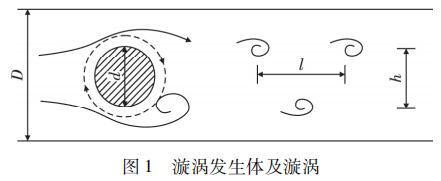 氣體渦輪計量表是由漩渦發(fā)生體、頻率檢測器和信號轉換器等環(huán)節(jié)組成,輸出 4 ~ 20 mADC 信號或脈沖電壓信號。其測量原理是在流動的流體中的垂直流動方向安放 1 根或多根非流體型阻流體,在一定的流量范圍內,流體在阻流體兩側交替地分離、釋放出 2 串頻率正比于管道內的平均流速、規(guī)則的、不對稱有規(guī)律的交替漩渦列,如圖 1 所示,且兩側漩渦旋轉方向相反。采用檢測元件測出漩渦頻率就可以推算出流體的流量。