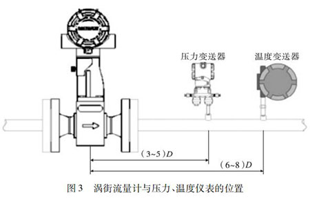 氣體渦輪計量表的口徑如果與工藝管道相同,不能滿足流量儀表要求時,或者在此流速下測量準確度不能保證時,需要縮小儀表口徑,從而提高管內流速,保證測量精度。上下游必須有足夠的直管段,若傳感器安裝點的上游在同一平面上有 2 個 90°彎頭時,上游直管段≥25D,下游直管段≥5D。根據(jù)測量的需要,需在氣體渦輪計量表附近測量壓力和溫度時,測壓點應在傳感器下游的( 3 ~ 5) D 處,測溫點應在傳感器下游的( 6 ~ 8) D 處,如圖 3 所示。
