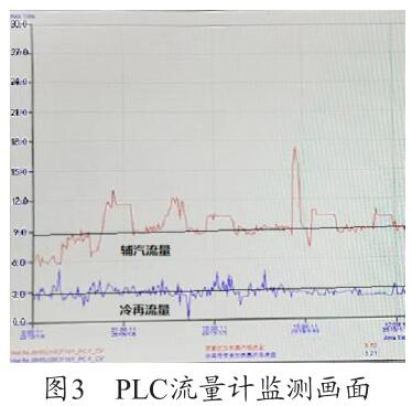 通過圖3 PLC 流量計監(jiān)測畫面可以看出,PLC 上輔汽測量用的氣體渦輪流量表的量程設(shè)置為30t/h,現(xiàn)場設(shè)備量程實(shí)際為6t/h,兩者嚴(yán)重不符,因此測量值4t/h 為錯誤值(單臺機(jī)組運(yùn)行),需要對程序進(jìn)行修改。