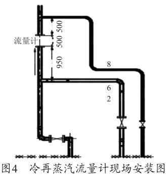 根據(jù)圖1渦街流量安裝要求示意圖及廠家的設(shè)備說明書要求,流量計上游的直管段長度至少為20D≈1 300mm,下游的直管段至少在5D≈325mm,D=65mm 為管道直徑。圖4為冷再蒸汽流量計現(xiàn)場安裝圖,流量計上游僅為950mm<1600mm,此流量計安裝位置有誤,對測量值有一定的影響,造成測量偏差,需調(diào)整流量計的安裝位置。