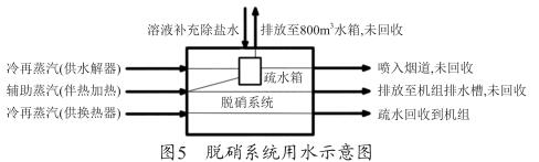 從圖5可以看出,脫硝系統(tǒng)所使用的冷再蒸汽和輔助蒸汽換熱后全部冷凝為疏水,供水解器的蒸汽和部分伴熱加熱的蒸汽回收至脫硝系統(tǒng)的疏水箱,部分伴熱蒸汽疏水直接排放至機(jī)組排水槽,未進(jìn)行回收。疏水箱的水一部分被脫硝系統(tǒng)利用,另一部分排放至機(jī)組800m 3 水箱,未進(jìn)行回收。下面結(jié)合耗水量對蒸汽耗量進(jìn)行判斷 :