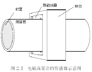 傳感器的主要作用是將通過(guò)管道的流量信號(hào)進(jìn)行轉(zhuǎn)換,將其轉(zhuǎn)為電動(dòng)勢(shì)。市面上常見(jiàn)的傳感器主要有下圖 2.4 中如測(cè)量管、鐵芯、勵(lì)磁線圈、襯里等結(jié)構(gòu)。