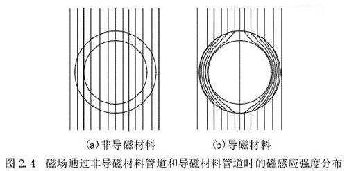1.測(cè)量管:主要是傳感器的管道,該管道由高導(dǎo)電率非導(dǎo)磁材料制成,可保證流體在通過(guò)時(shí)能夠表現(xiàn)出自身的電磁效應(yīng),在該管道內(nèi)中安裝了內(nèi)襯。使用非導(dǎo)磁材料的原因是保證勵(lì)磁線圈中所產(chǎn)生的磁場(chǎng)不會(huì)順著管道流走,確保測(cè)量管道內(nèi)部產(chǎn)生明顯的磁感應(yīng)線,下圖 2.4 中展示了利用非導(dǎo)磁材料和導(dǎo)磁材料管道中所產(chǎn)生磁感應(yīng)線的情況。