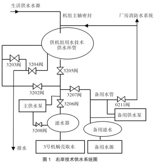 大化電廠技術(shù)供水包括右岸和左岸供水,本文以右岸 3 號(hào)機(jī)技術(shù)供水系統(tǒng)增設(shè)帶現(xiàn)場顯示燃油流量表技術(shù)改造方案為例進(jìn)行分析說明。右岸技術(shù)供水系統(tǒng)(見圖 1)由各機(jī)組單元蝸殼取水主水源、濾水器、主供水泵、正反向切換閥(3202 閥與 3204 閥開為反向取水,3203 閥與 3205閥開為正向取水,運(yùn)行時(shí)只開其中一種)、備用水源、備用濾水器、備用供水泵和備用總水管構(gòu)成一個(gè)整體,并通過 0211 閥與廠房消防水系統(tǒng)相連接,可通過主水源自流供水、主水源水泵增壓供水、備用水源自流供水、備用水源水泵增壓供水等不同供水方式向機(jī)組推力軸承冷卻器和發(fā)導(dǎo)軸承冷卻器、水導(dǎo)軸承冷卻器、發(fā)電機(jī)空氣冷卻器提供冷卻水源。機(jī)組技術(shù)供水正常運(yùn)行采用單元蝸殼取水的供水方式運(yùn)行,以備用水源供水為輔。機(jī)組主軸密封用水分別取自生活供水水源和技術(shù)供水備用總管水源,向機(jī)組大軸提供可調(diào)水壓端面密封水源。在現(xiàn)場配置一個(gè)技術(shù)供水現(xiàn)地單元柜,實(shí)現(xiàn)對(duì)機(jī)組技術(shù)供水系統(tǒng)設(shè)備自動(dòng)控制、故障保護(hù)及報(bào)警。柜內(nèi)配置可編程 PLC 控制系統(tǒng),電控柜對(duì)主供增壓泵、3202 至 3208 電動(dòng)碟閥進(jìn)行流程控制。