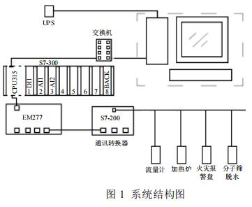 集氣站是收集氣井所生產(chǎn)天然氣的站場,在集氣站內(nèi)對天然氣進(jìn)行節(jié)流降壓、加熱、調(diào)壓計量等各種工藝預(yù)處理,設(shè)備眾多且分散。為方便進(jìn)行檢測和操作,必須進(jìn)行統(tǒng)一的數(shù)據(jù)采集,在監(jiān)控臺進(jìn)行數(shù)據(jù)的管理。集氣站設(shè)備主要包括加熱爐、防凍液流量計、分子篩、火災(zāi)報警盤,以及供電設(shè)備 UPS 等,這些不同廠家的設(shè)備基本都支持Modbus 協(xié)議,通過 Modbus 通訊可以將這些數(shù)據(jù)采集。為了有效降低成本,設(shè)計了如圖 1 所示的系統(tǒng)。系統(tǒng)采用西門子 S7-300 控制器,通過以太網(wǎng)連接上位機(jī)監(jiān)控軟件,再通過 MP277 連接S7-200 的方式。S7-200 控制器自帶 RS485 接口,能夠進(jìn)行 Modbus 通訊,采集現(xiàn)場各種設(shè)備數(shù)據(jù)。*后通過以太網(wǎng)通訊將設(shè)備數(shù)據(jù)上傳至監(jiān)控軟件,方便操作人員進(jìn)行監(jiān)控,該方案簡單有效,能夠?qū)崿F(xiàn)集氣站內(nèi)設(shè)備的狀態(tài)監(jiān)控,數(shù)據(jù)處理,有效的進(jìn)行天然氣的生產(chǎn)工作。