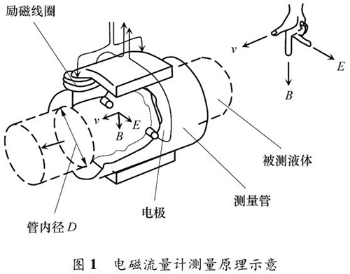 純化水流量表的測(cè)量原理如圖 1 所示。根據(jù)法拉*電磁感應(yīng)定律,導(dǎo)電液體在磁場(chǎng)中流動(dòng)會(huì)產(chǎn)生電動(dòng)勢(shì) E,它與磁感應(yīng)強(qiáng)度 B、導(dǎo)電液體平均流速 v 成一定比例關(guān)系: