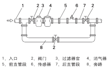 e.或選用自動(dòng)清洗型過濾器。若被測(cè)液體含有氣體.則應(yīng)在傳感器上游側(cè)裝消氣器。過濾器和消氣器的排污口和消氣口要通向安全的場(chǎng)所。