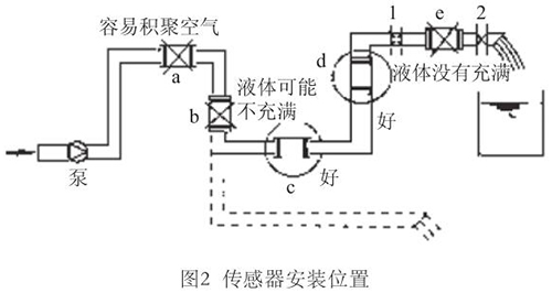 液體流動方向必須與傳感器殼體上箭頭方向一致。對于能正反向測量的冷卻水流量計,若方向不一致雖仍可測量,但設(shè)定的顯示流動正反方向不符,必須改正之。若拆傳感器工作量大,也可改變傳感器上箭頭方向和重新設(shè)定顯示儀表符號。管道未充滿液體主要是管網(wǎng)工程設(shè)計或傳感器安裝位置不妥,使傳感器測量管內(nèi)不能充滿液體。應(yīng)采取措施,避免安裝如圖2所示a,e位置和以虛線管排放時b位置,改裝到c,d位置。