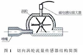 用水流量計(jì)基本構(gòu)造見(jiàn)圖1。被測(cè)流體在流經(jīng)葉輪之前流道會(huì)減縮,流速增加,流體經(jīng)過(guò)葉輪后葉片旋轉(zhuǎn),磁電傳感器記錄葉片轉(zhuǎn)動(dòng)頻率,得到被測(cè)流體相對(duì)應(yīng)的流量。
