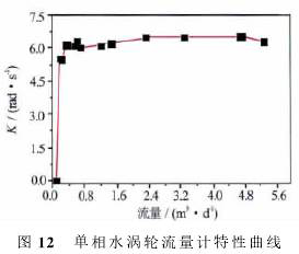 可以看出,渦輪啟動(dòng)后*先進(jìn)入一個(gè)非線(xiàn)性段,在非線(xiàn)性相應(yīng)段,K值隨著流量增加而增大;當(dāng)流量比較大(單相水超過(guò)0.5m3/d,單相油超過(guò)1m3/d)時(shí),渦輪進(jìn)入線(xiàn)性段,在線(xiàn)性響應(yīng)段,K值達(dá)到峰值,有相對(duì)較小的波動(dòng)。