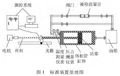燃油動態(tài)流量標準裝置的工作原理為:工作過程中電機旋轉(zhuǎn),驅(qū)動滾珠絲杠帶動標準體積管活塞左行,排出液體流經(jīng)控制閥門及被檢流量計后,經(jīng)過過濾器回到儲油箱;同時,儲油箱里的油經(jīng)過下游管段進入標準體積管。