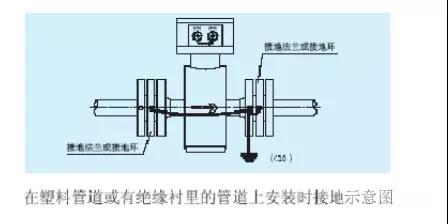 傳感器在塑料管道上或在有絕緣襯里的管道上安裝,傳感器的兩端應(yīng)安裝接地環(huán)、或接地法蘭、或帶有接地電*的短管,按下圖接地。
