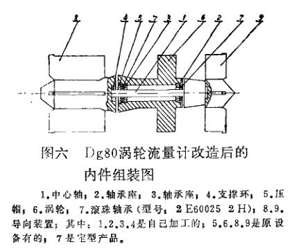使甩中譯杯料在液氨中發(fā)生膨脹,會使渦輪轉(zhuǎn)速減小,甚至轉(zhuǎn)不動。以后改為石墨軸.早t。使用甲段時間,由于軸承受滑動摩擦,李乍期高速雄轉(zhuǎn)下很快磨損,間隙增大,渦羚軸串動,造成計量不準?!,F(xiàn)在釋們改用不銹鋼滾珠軸承,這樣將滑動摩擦改為滾動摩擦,起動轉(zhuǎn)矩小,轉(zhuǎn)動靈活。近兩年在每年一度大檢修中,拆下檢查沒有發(fā)現(xiàn)什么問題(改制零件的詳細情況見圖二、三、四、五、六)。