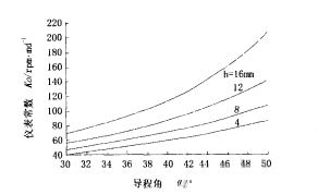 (2)可見,對確定的渦輪流量傳感器,易知口徑D大,K。值?。蝗~片數(shù)n大,K。值大等。如果要獲得較大的儀表常數(shù),就一要對渦輪傳感器的結(jié)構(gòu)參數(shù)進(jìn)行優(yōu)化設(shè)計,從圖(2)可以看出,葉片高度h增加,K。增大;導(dǎo)程角增大,K。增大。對于φ19的過環(huán)空大排量渦輪流量計而言,由上式計算得K。=74.567rpm/m³/d,而水中標(biāo)定的Kw=78.89rpm/m³/d,表1給出不同口徑和不同導(dǎo)程角下渦輪流量計固有儀表常數(shù)的計算值。