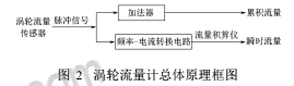 渦輪的旋轉(zhuǎn)角速度是通過裝在機(jī)殼外的傳感線圈來檢測。當(dāng)渦輪葉片切割由殼體內(nèi)永久磁鋼產(chǎn)生的磁力線時(shí),就會(huì)引起傳感線圈中的磁通變化。傳感線圈將檢測到的磁通周期變化信號(hào)送入前置放大器,對(duì)信號(hào)進(jìn)行放大、整形,產(chǎn)生與流速成正比的脈沖信號(hào),送入單位換算與流量積算電路得到并顯示累積流量值;同時(shí)亦將脈沖信號(hào)送入頻率電流轉(zhuǎn)換電路,將脈沖信號(hào)轉(zhuǎn)換成模擬電流量,進(jìn)而指示瞬時(shí)流量值。圖2為渦輪流量計(jì)總體原理框圖。