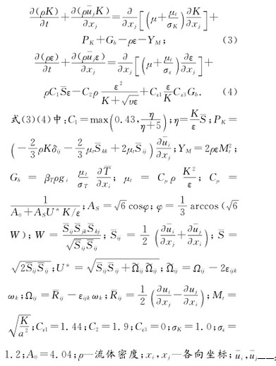 各向流速平均值;a—聲速;μ—動(dòng)力粘性系數(shù);υ—運(yùn)動(dòng)粘性系數(shù);K—湍流動(dòng)能;ε—湍流耗散率;βT—膨脹系數(shù);ωk—角速度;—時(shí)均轉(zhuǎn)動(dòng)速率張量;如不考慮浮力影響Gb=0,如流動(dòng)不可壓縮,=0,YM=0。