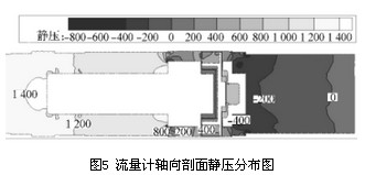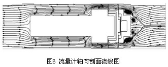 以流量Q=250m3/h的數(shù)值模擬計(jì)算結(jié)果為例進(jìn)行渦輪流量計(jì)內(nèi)部流場(chǎng)及壓力場(chǎng)的分析,圖5為渦輪流量計(jì)軸向剖面靜壓分布圖,前導(dǎo)流器前后的壓力場(chǎng)分布較均勻且壓力梯度較小,在機(jī)芯殼體與葉輪支座連接凸臺(tái)處壓力有所增加,連接面后壓力又逐漸減小,故認(rèn)為流體流經(jīng)葉輪支座產(chǎn)生壓力損失的主要原因是連接處存在凸臺(tái),導(dǎo)致流場(chǎng)出現(xiàn)較大變化,不能平滑過(guò)渡,建議將葉輪支座與機(jī)芯殼體的連接改為圓弧線型或流線型。觀察圖5和圖6,當(dāng)流體流經(jīng)葉輪從后導(dǎo)流器流出渦輪流量計(jì)時(shí),壓力梯度變化明顯,存在負(fù)壓區(qū)域并造成很大的壓降,在后導(dǎo)流器凸臺(tái)及流量計(jì)出口處速度變化明顯,由于氣流通過(guò)后導(dǎo)流器后流道突擴(kuò),在后導(dǎo)流器背面形成明顯的低速渦區(qū),產(chǎn)生了漩渦二次流。