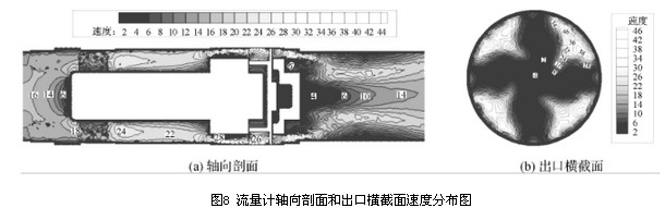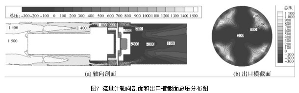 結(jié)合圖7、圖8流量計(jì)軸向剖面和出口橫截面的總壓及速度分布圖,其速度分布與壓力分布相似,流量計(jì)流道內(nèi)速度分布較均勻的區(qū)域其壓力梯度變化也較小,即流道內(nèi)速度的分布和變化與壓力損失大小相關(guān)。由流量計(jì)軸向剖面和出口橫截面的速度及壓力分布圖可以看出,流量計(jì)后導(dǎo)流器處產(chǎn)生的漩渦二次流影響了出口橫截面處的速度及壓力分布