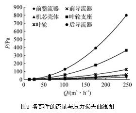 流量計(jì)各部件的壓力損失隨流量變化的趨勢(shì)與流量計(jì)總壓力損失隨流量的變化趨勢(shì)相同,其擬合公式為系數(shù)不同的二次多項(xiàng)式。各部件的壓力損失與流量呈二次函數(shù)關(guān)系,隨著流量的增加,壓力損失顯著增加。