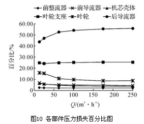 觀察圖10各部件壓力損失百分比圖,可見(jiàn)前整流器、前導(dǎo)流器和機(jī)芯殼體處的壓力損失很小,葉輪支座處壓力損失約占總壓力損失的1/4。前整流器所占?jí)毫p失比例在各流量點(diǎn)基本保持不變,前導(dǎo)流器和機(jī)芯殼體處的壓力損失隨流量的增加其比例略有降低,葉輪支座處壓力損失隨流量的增加其比例略有增加,但總體上受流量影響不大。葉輪處的壓力損失隨流量從13m3/h增加至250m3/h,其比例從15.88%降至8.71%,降幅明顯,后導(dǎo)流器處的壓力損失占總壓力損失的大半,隨著流量從13m3/h增加至250m3/h其壓力損失比例由43.77%升至55.83%,增幅明顯??傊髮?dǎo)流器、葉輪支座和葉輪是流體流經(jīng)渦輪流量計(jì)產(chǎn)生壓力損失的主要影響部件,可通過(guò)優(yōu)化其結(jié)構(gòu)以降低渦輪流量計(jì)的總壓力損失。