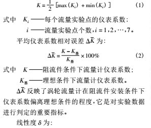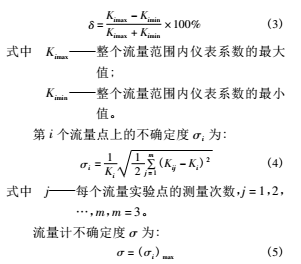 渦輪流量計的原理:當被測流體流過傳感器時,在流體作用下,葉輪受力旋轉(zhuǎn),其轉(zhuǎn)速與管道平均流速成正比,葉輪的轉(zhuǎn)動周期改變磁電轉(zhuǎn)換器的磁阻值,檢測線圈中的磁通隨之發(fā)生周期性變化,產(chǎn)生周期性的感應電勢,即電脈沖信號。基于渦輪流量計的測量原理,根據(jù)渦輪流量計檢定規(guī)程,確定了實流實驗結(jié)果的評價指標,其中包括: 儀表系數(shù)、平均儀表系數(shù)相對誤差、線性度和不確定度。