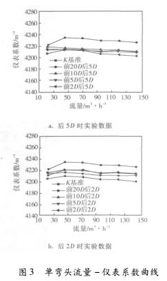 圖3為單彎頭流量-儀表系數(shù)曲線。